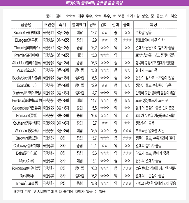 등록품종. Tifblue와 Menditon의 교배종. 열매는