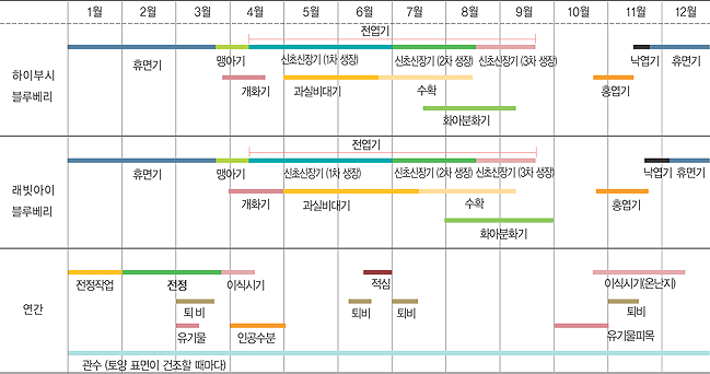 블루베리 품종 고유의 맛과 풍미는 생과로 즐기는 것이 으뜸인 것은 분명하지만, 냉장 및 냉동 보관을 통해서 연중 생과에 뒤떨어지지 않는 맛과 풍미를 지닌 블루베리를 즐길 수 있다. 블루베리 열매를 냉장 보관시 2주정도 보관이 가능하며, 연중 블루베리를 즐기고자 할 경우엔, 밀봉한 용기에 담아 냉동 보관한 뒤 필요할 때마다 해동시켜 즐기면 된다. 냉동 보관 후 해동된 과육 색상의 변화나 풍미 변화는 거의 없다. 이외에도 햇볕에 말려 건과로 즐길 수 있으며, 잼, 소스, 시럽 등으로 가공하여 각종 음식 및 과자류에 이용할 수 있다.