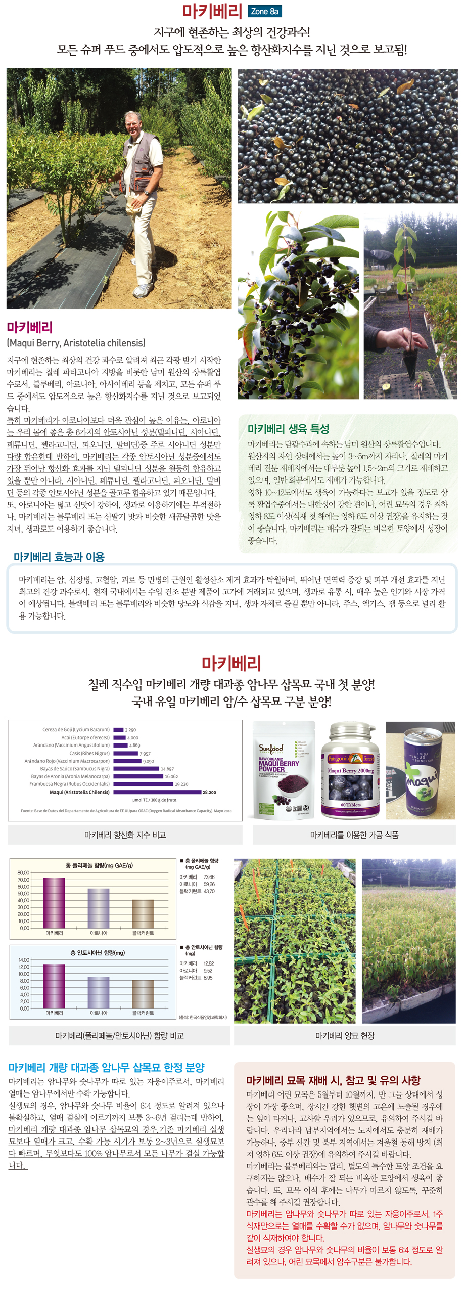 * 마키베리(마퀴베리)는 지구에 현존하는 최상의 건강 과수로 밝혀져 최근 높은 관심을 모으는 칠레 파타고니아 지방을 비롯한 남미 원산의 상록활엽수로서 블루베리, 아로니아, 사이베리 등을 제치고, 모든 슈퍼푸드 중에서도 압도적으로 높은 항산화지수를 지닌 것으로 보고 되었습니다.