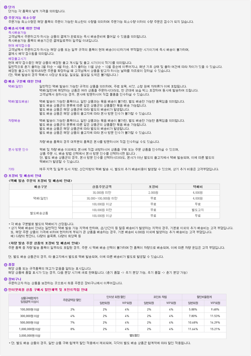 | 규격 | 단가 | 수량 | 주문최소수량 | 배송시기 | 배송구분 | 장바구니담기 및 구매 |